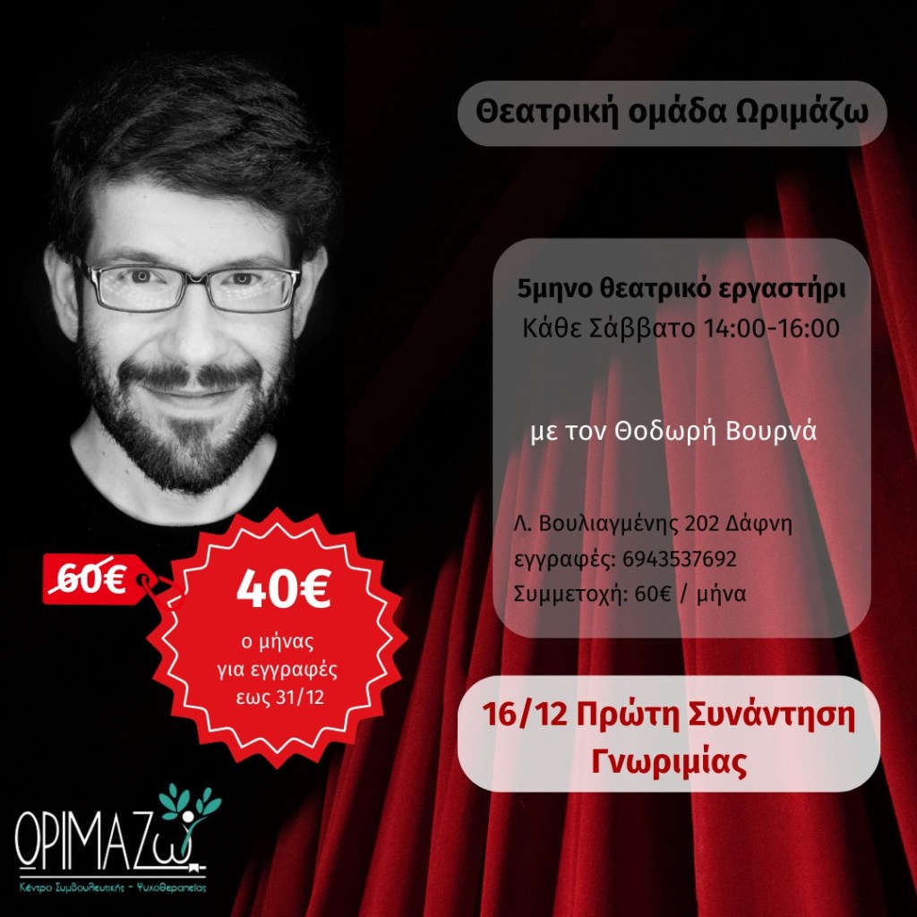 Η πρώτη μας συνάντηση για τα 5μήνα εργαστήρια μας «Υποκριτική στην Κάμερα¨ και ¨Θεατρικό εργαστήρι¨ είναι το Σάββατο 16/12 και ώρα 12:00 στο Κέντρο Ωριμάζω 1ος όροφος Λεωφόρος Βουλιαγμένης 202 (πλησίον μετρό Δάφνης)