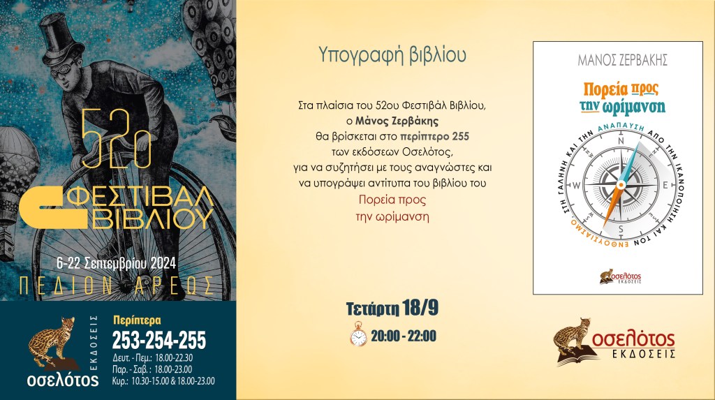 Θα χαρώ να σας δω στο 52ο Φεστιβάλ Βιβλίου στο Πεδίον Άρεως στο περίπτερο 255 των εκδόσεων του Οσελότου την Τετάρτη 18/9 20:00 έως 22:00 να μιλήσουμε για βιβλία και την Πορεία προς την Ωρίμανση.